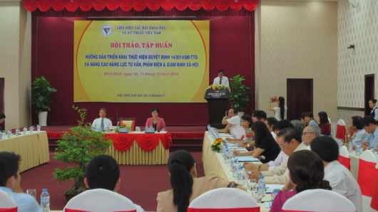 Ngày 10-11/10/2014, Liên hiệp các Hội Khoa học và Kỹ thuật Việt Nam và Liên hiệp các Hội Khoa học và Kỹ thuật tỉnh Bình Định cùng phối hợp tổ chức Hội thảo, tập huấn “Hướng dẫn triển khai thực hiện Quyết định 14/2014/QĐ-TTg và nâng cao năng lực tư vấn, phản biện và giám định xã hội” cho Liên hiệp Hội các tỉnh, thành phố khu vực miền Trung - Tây Nguyên. Chủ trì hội thảo, tập huấn do TS.Trần Việt Hùng – Phó Chủ tịch Liên hiệp Hội Việt Nam; PGS.TS. Phạm Bích San – Phó Tổng Thư ký kiêm Trưởng Ban Tư vấn, phản biện và giám định xã hội Liên hiệp Hội Việt Nam; bà Nguyễn Thị Thanh Bình – Chủ tịch Liên hiệp Hội tỉnh Bình Định.