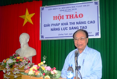 Ngày 13/10/2015, Liên hiệp các Hội Khoa học và Kỹ thuật tỉnh Quảng Ngãi đã tổ chức Hội thảo khoa học “Giải pháp khả thi nâng cao năng lực sáng tạo của đội ngũ cán bộ khoa học và công nghệ tỉnh Quảng Ngãi”. Tham dự Hội thảo có hơn 50 đại biểu đại diện các sở, ban, ngành, cán bộ làm công tác khoa học và kỹ thuật của các cơ quan, hội đoàn thể trong tỉnh; TS. Nguyễn Kim Hiệu - Chủ tịch Liên hiệp các Hội Khoa học và Kỹ thuật tỉnh chủ trì Hội thảo. |