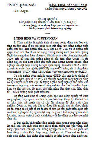 Tỉnh ủy Quảng Ngãi vừa ban hành Nghị quyết số 01-NQ/TU ngày 11/5/2021 của Hội nghị Tỉnh ủy lần thứ 3 (Khóa XX) về huy động và sử dụng hiệu quả các nguồn lực để đẩy mạnh phát triển công nghiệp. |