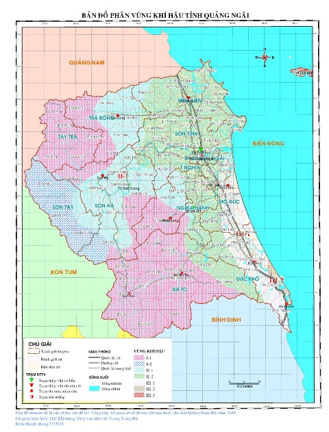 Tỉnh có vùng núi, trung du và đồng bằng ven biển sát nhau, bên cạnh đó là nơi chịu ảnh hưởng các nhiễu động nhiệt đới (bão, áp thấp nhiệt đới) kết hợp gió mùa Đông Bắc vào mùa mưa và gió mùa Tây Nam, áp thấp nóng phía Tây vào mùa hè đã tạo nên đặc điểm khí hậu rất riêng cho Quảng Ngãi. Căn cứ vào yêu cầu thực tiễn cần phải phân vùng khí hậu các vùng trong tỉnh, để từ đó làm căn cứ quy hoạch phát triển kinh tế xã hội địa phương như du lịch, công nghiệp, đô thị và đặc biệt là nông nghiệp. Dựa vào các tiêu chí cơ bản: địa hình, bức xạ mặt trời, nhiệt độ, lượng mưa, độ ẩm .. Từ kết quả nghiên cứu đề tài khí tượng thủy văn tỉnh Quảng Ngãi vừa qua đã phân định các vùng khí hậu cơ bản của tỉnh Quảng Ngãi như sau: 1) Vùng khí hậu núi cao và núi vừa - có độ cao > 500m (Vùng I trên bản đồ) Tổng nhiệt độ năm dưới 85000C; tổng lượng bức xạ năm 130kcal/cm2/năm; tổng số giờ nắng trong năm dưới 1900 giờ và tổng lượng mưa năm trên 3000mm có các khu vực sau: Khu vực khí hậu phía tây bắc Trà Bồng; khu vực khí hậu phía nam gồm phần phía tây các huyện Minh Long, Ba Tơ và tây nam huyện Sơn Hà. Ngoài ra còn có phần lớn diện tích huyện Sơn Tây, một phần tây nam huyện Tây Trà, tuy nhiên những vùng này có tổng lượng mưa năm dưới 2600mm. 2) Vùng khí hậu núi thấp và trung du (Vùng II trên bản đồ) Trong vùng khí hậu này có tổng nhiệt độ trung bình năm từ 8500oC đến 9300oC; tổng lượng bức xạ năm từ 130kcal/cm2.năm đến 140kcal/cm2.năm; tổng số giờ nắng từ 1900giờ đến 2100giờ/năm và có tổng lượng mưa năm từ 2600mm đến 3000mm. Gồm những khu vực sau: Khu vực khí hậu phía đông huyện Trà Bồng, phía tây huyện Bình Sơn, phần lớn huyện Sơn Hà, một số xã phía tây huyện Sơn Tịnh, phía tây các xã Nghĩa Thắng, Nghĩa Thuận, Nghĩa Thọ. Ngoài ra, một số nơi có cùng về tổng lượng bức xạ, nhiệt độ và số giờ nắng nhưng lại có sự biến động về lượng mưa từ 2100mm đến trên 3000mm và tăng đột ngột từ tây sang đông gồm: Phía đông các xã: Long Sơn, Long Mai,Thăng An, các xã thuộc phía tây các huyện: Nghĩa Hành, Ba Tơ; Long Hiệp (Minh Long), phía tây xã Đức Phú, phần lớn xã Phổ Phong, phía tây các xã Phổ Cường và Phổ Thạnh. 3) Vùng khí hậu đồng bằng, duyên hải và đảo Lý Sơn Trong vùng khí hậu này có tổng nhiệt độ năm trên 9300oC; tổng lượng bức xạ trên 140kcal/cm2. năm và trên 2100 giờ nắng/năm. Căn cứ vào tổng lượng mưa năm, ta có 3 tiểu vùng như sau: a) Tiểu vùng khí hậu phía đông các huyện: Bình Sơn, Sơn Tịnh; toàn bộ TP Quảng Ngãi và huyện Tư Nghĩa; phần lớn huyện Nghĩa Hành (trừ các xã Hành Tín Đông, Hành Tín Tây, Hành Thiện, phía tây các xã: Hành Dũng, Hành Thịnh, Hành Phước). Tổng lượng mưa năm của tiểu vùng này từ 2100mm - 2600mm. b) Tiểu vùng khí hậu thuộc phần lớn huyện Mộ Đức, Đức Phổ. Tổng lượng mưa năm của tiểu vùng dưới 2100mm. Đây là một tiểu vùng nắng nhiều và mưa ít nhất Tỉnh; trong đó hàng năm 2 tháng II và III có lượng mưa rất thấp, là thời kỳ ít mưa nhất trong năm. c) Tiểu vùng khí hậu thuộc huyện đảo Lý Sơn, tổng lượng mưa năm của tiểu vùng này từ 2100mm - 2600mm, là vùng có khí hậu hải dương khá đặc sắc. Trên đây là các vùng khí hậu được phân chia từ những độ cao địa hình, các yếu tố khí tượng, tuy nhiên, những năm gần đây diễn biến thời tiết ngày càng phức tạp, khôn lường. Biến đổi khí hậu đã, đang và sẽ tiếp tục mạnh mẽ, thời tiết cực đoan diễn ra với tần suất nhiều hơn, mạnh hơn ở tỉnh ta như lũ lịch sử trên sông Trà Bồng năm 2009, trên sông Trà Khúc, sông Vệ năm 2013, đợt nắng nóng kéo dài lịch sử từ tháng 5 đến nay trong năm 2015 đã chứng minh điều này. Do đó để thích ứng với sự biến đổi khí hậu mạnh mẽ cần sự vào cuộc của các cấp chính quyền và nhất là người dân để có biện pháp hữu hiệu giảm thiểu thiệt hại do thiên tai gây ra./.