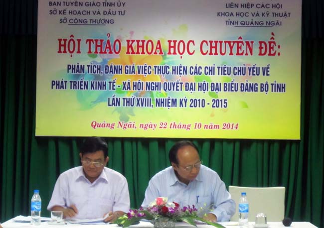 Sáng ngày 22/10/2014, Liên hiệp các Hội khoa học và Kỹ thuật tỉnh Quảng Ngãi phối hợp với Ban Tuyên giáo Tỉnh ủy, Sở Kế hoạch và Đầu tư, Sở Công Thương tổ chức Hội thảo Khoa học chuyên đề: “Phân tích, đánh giá việc thực hiện các chỉ tiêu chủ yếu về phát triển kinh tế -xã hội Nghị quyết Đại hội đại biểu Đảng bộ tỉnh lần thứ XVIII, nhiệm kỳ 2010 -2015". Ông Trần Tấn Châu – Phó trưởng Ban Tuyên giáo Tỉnh ủy và TS. Nguyễn Kim Hiệu - Chủ tịch Liên hiệp các Hội Khoa học và Kỹ thuật tỉnh chủ trì Hội thảo. Tham dự Hội thảo có Phó Chủ tịch Thường trực UBND tỉnh Quảng Ngãi Lê Quang Thích; đại diện lãnh đạo các Sở, ngành, hội, đoàn thể của tỉnh.